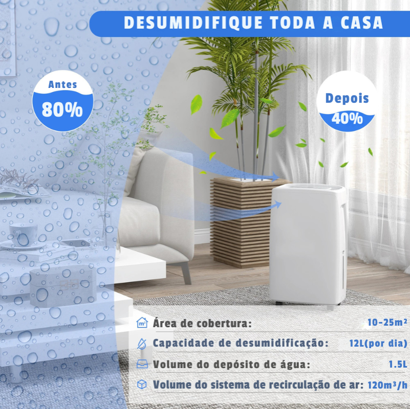 Con capacidad para eliminar hasta 12 litros de humedad al día, es ideal para espacios como dormitorios, salas de estar, cocinas y oficinas de hasta 10-25 m², ayudando a prevenir la condensación, el moho y los malos olores, además de proteger muebles y paredes.