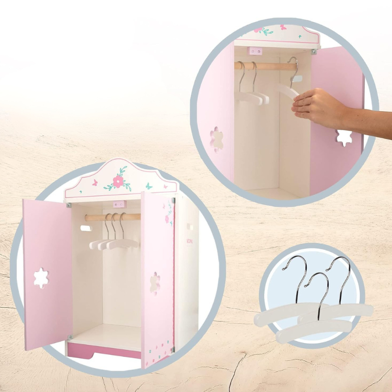 Hecho De Madera Natural Resistente Con Acabados Lisos, Este Armario Ofrece El Espacio Perfecto Para Organizar Y Colgar La Ropa De Las Muñecas, Fomentando El Orden Desde Pequeñas Y Fomentando El Juego Simbólico.