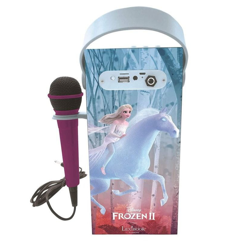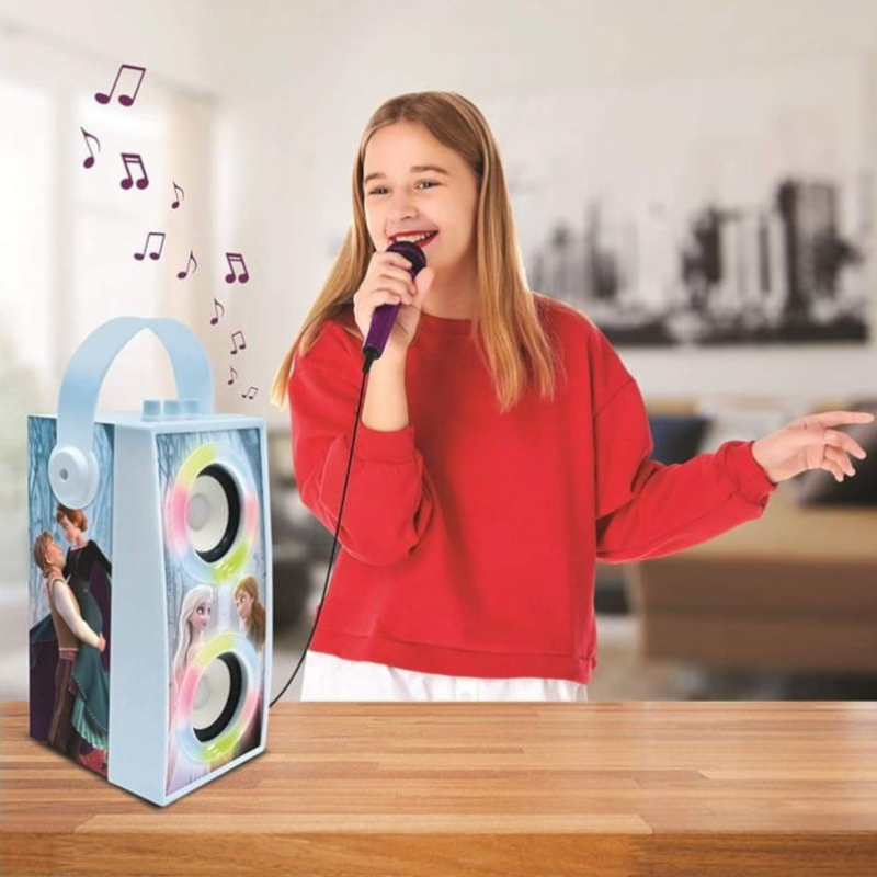 Con micrófono integrado y efecto de eco de voz, ofrece una experiencia interactiva ideal para fiestas y momentos creativos. Decorado con la temática de Frozen, es fácil de transportar gracias a su asa integrada e incluye múltiples opciones de conectividad.