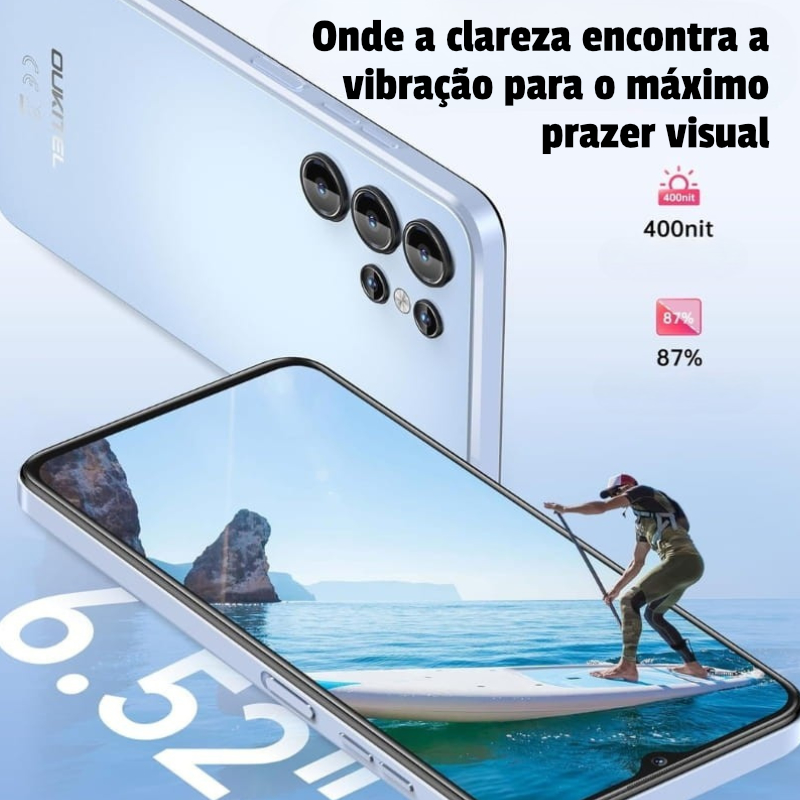 El Oukitel C1 presenta un diseño ultrafino y elegante, con un acabado azul y bordes suaves para un agarre cómodo. Su pantalla HD de 6.52 pulgadas (1280×720 píxeles) ofrece colores vibrantes e imágenes nítidas, ideal para videos, redes sociales y navegación.